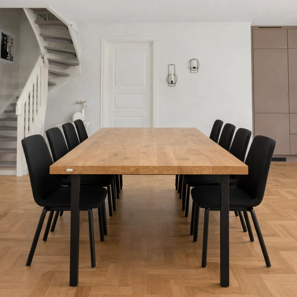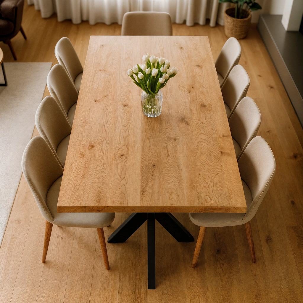 Această masă din stejar masiv aduce natura direct în casa ta. Blatul este finisat cu grijă pentru a păstra frumusețea și caracterul natural al lemnului. Lemnul de stejar este renumit pentru durabilitatea sa, fiind perfect pentru mese de dining sau pentru birouri. De asemenea, datorită varietății de dimensiuni disponibile, această masă se poate adapta perfect oricărei încăperi. Poți alege să-ți personalizezi masa sau să optezi pentru o variantă deja pregătită, cu tot cu cadru de susținere.